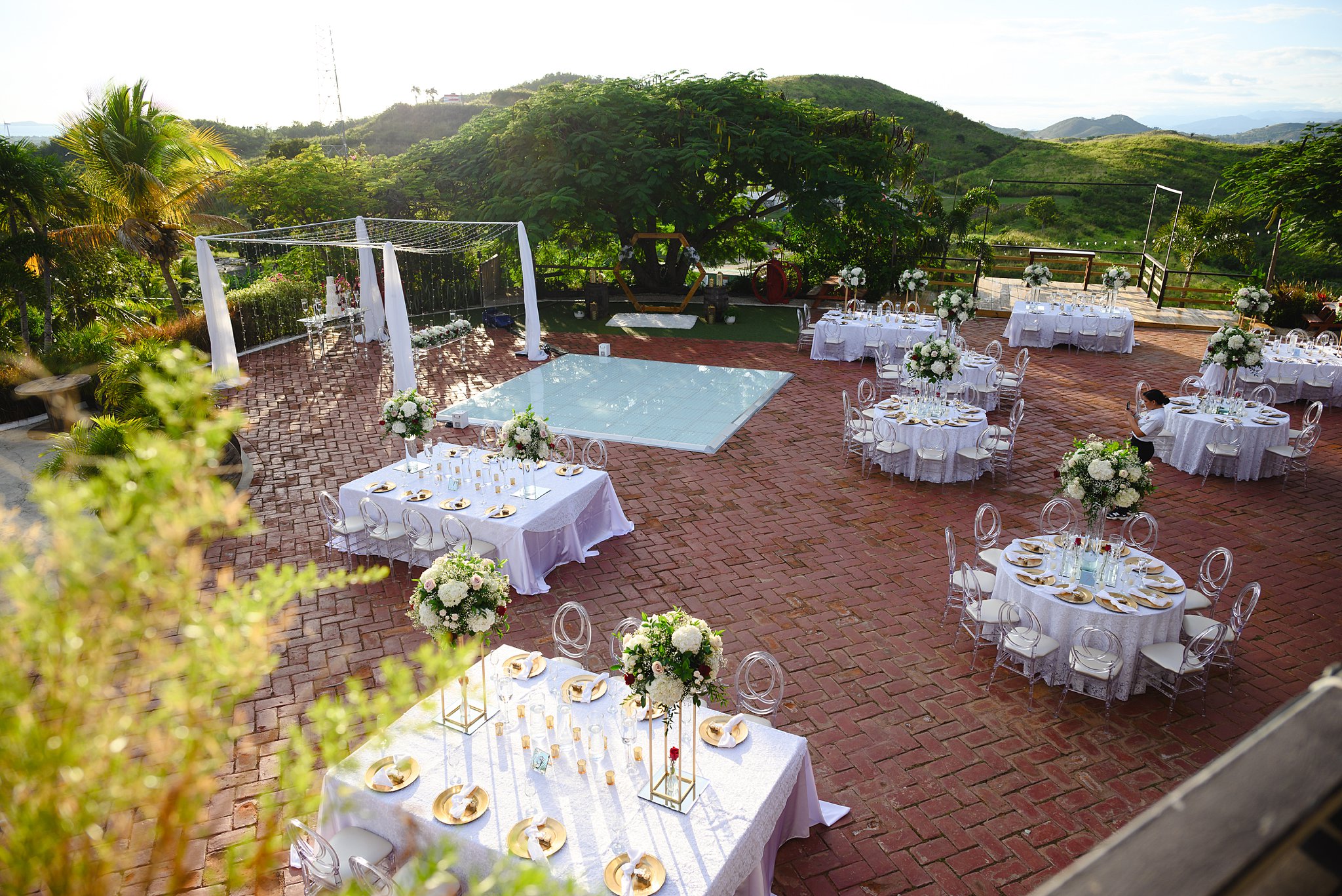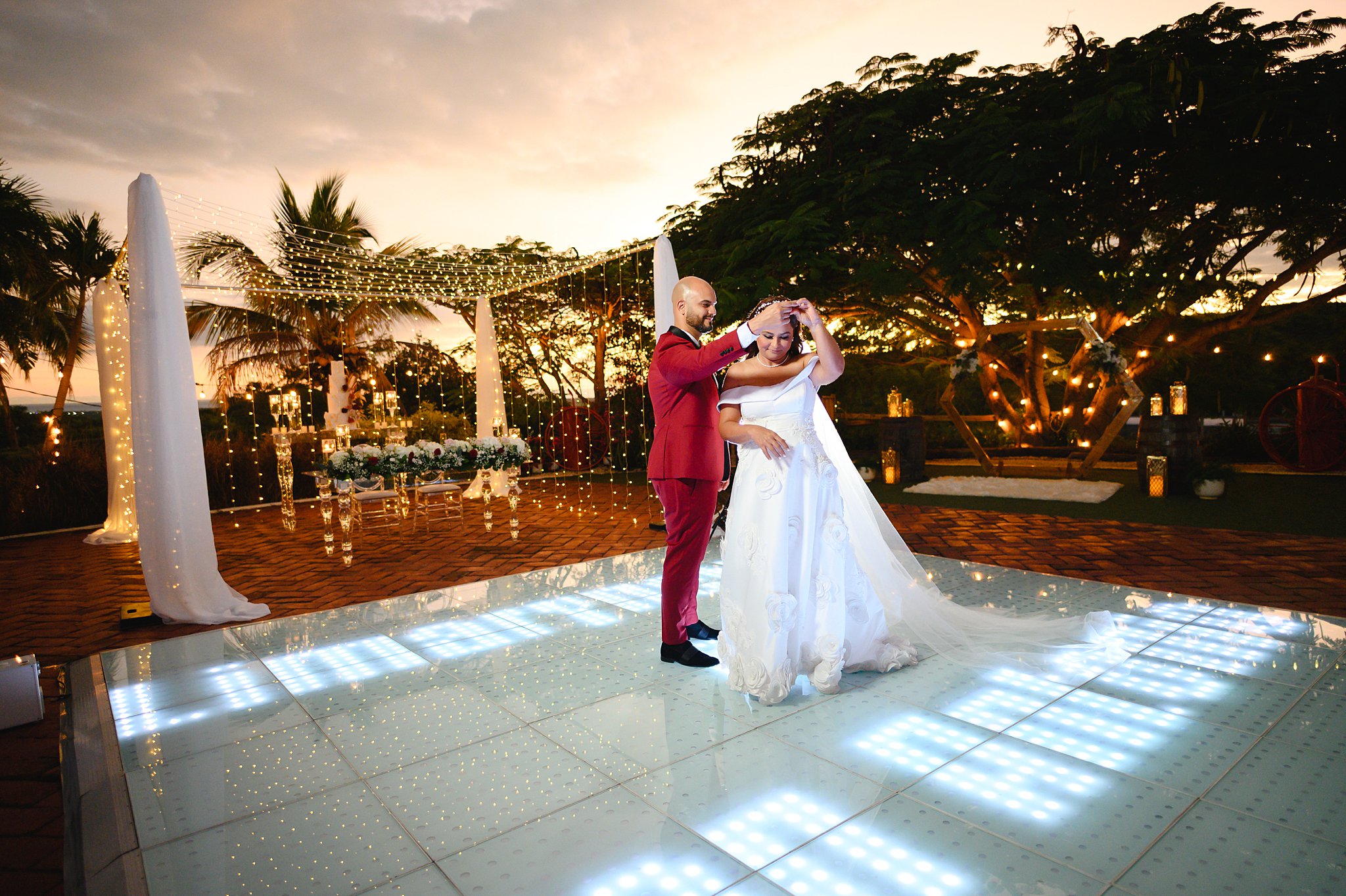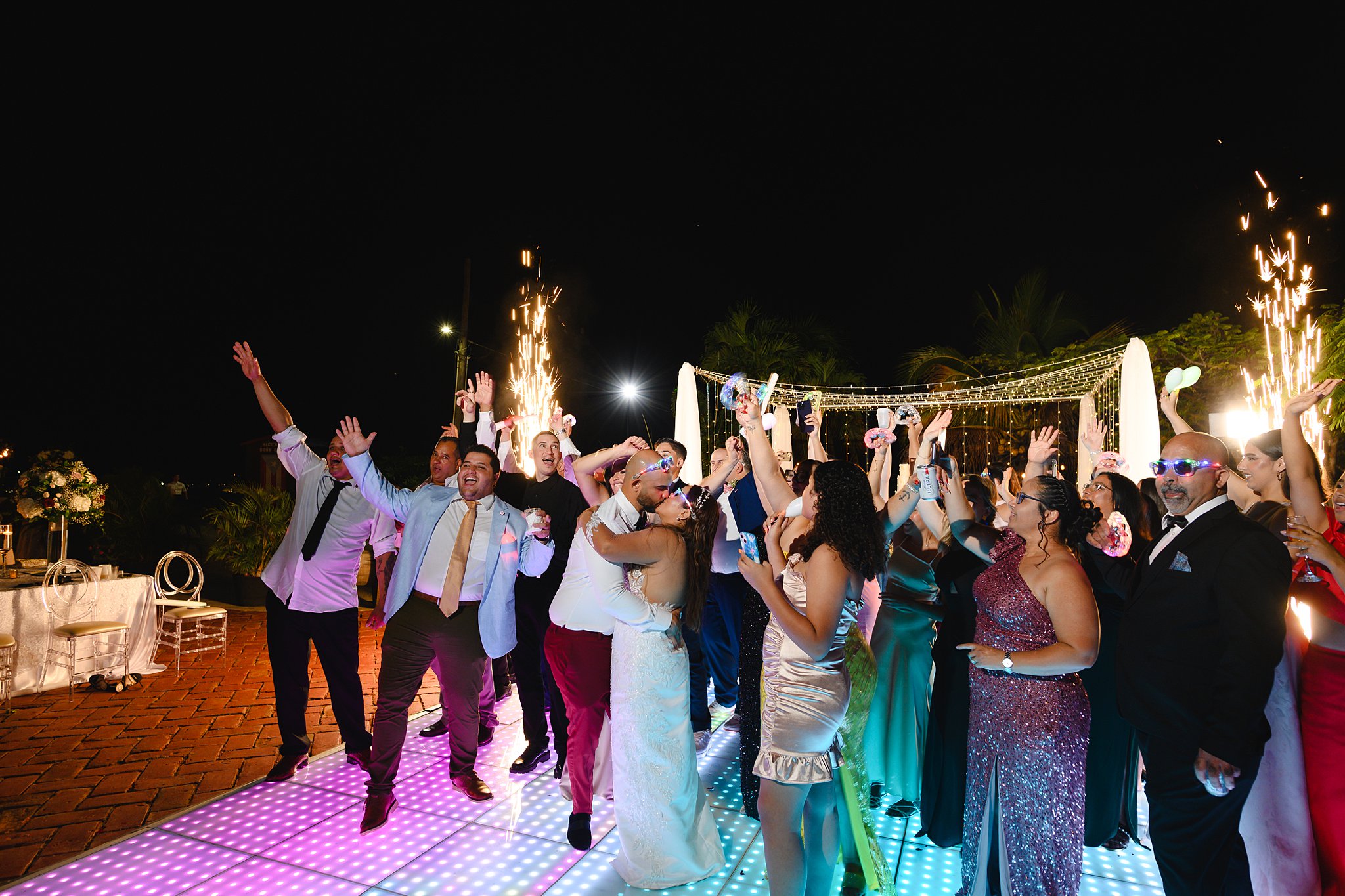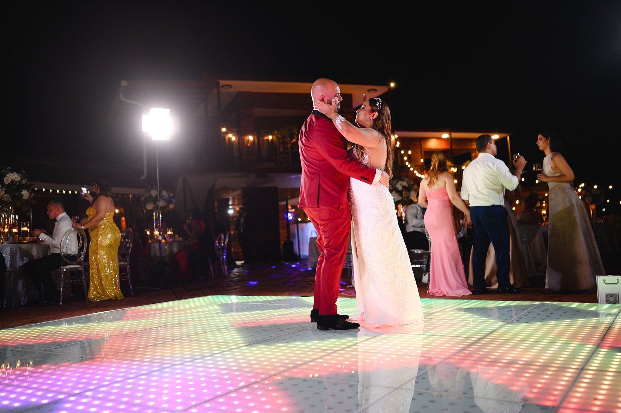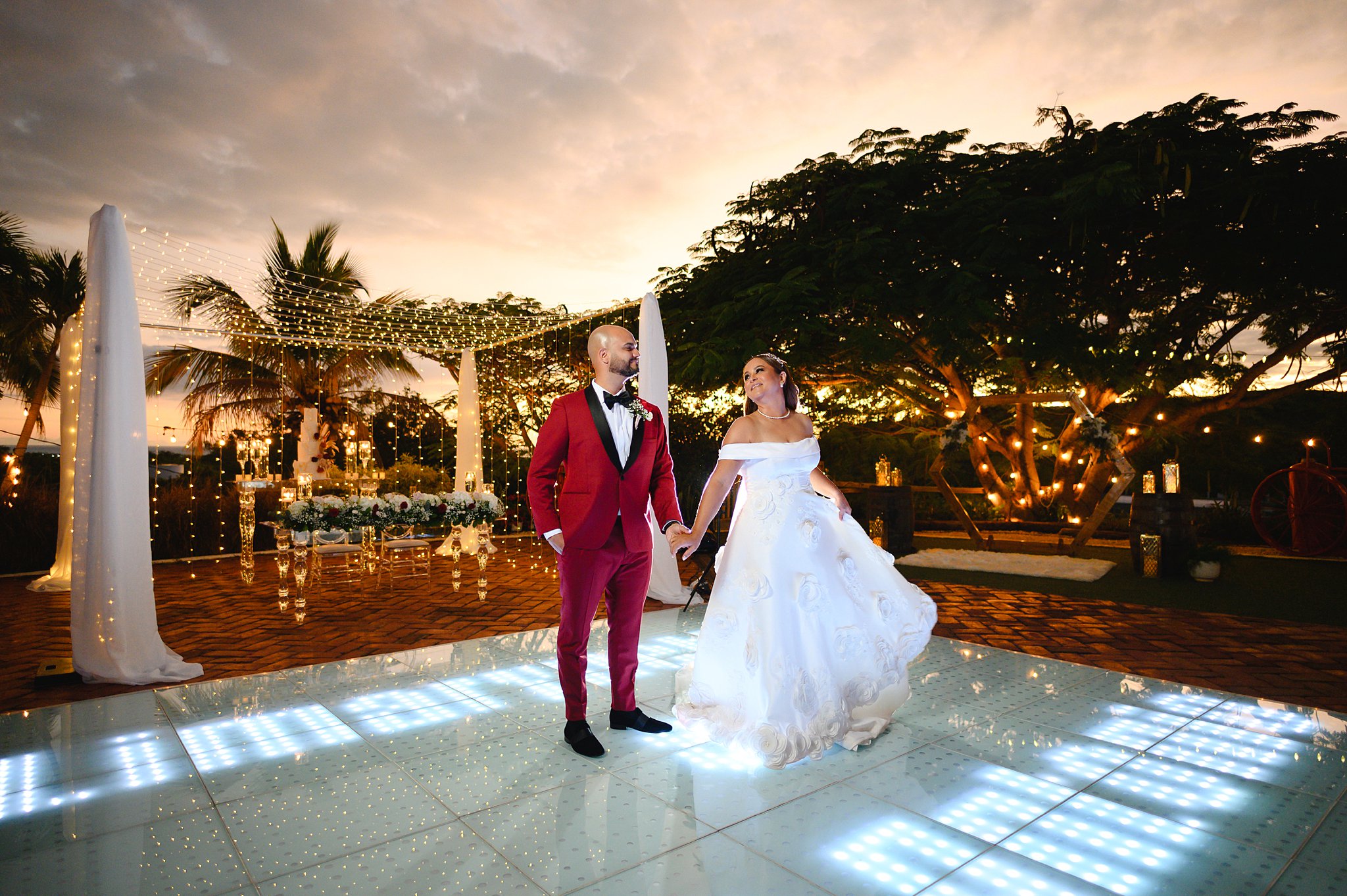 La ceremonia y la recepción tuvieron lugar al aire libre, bajo un cielo azul claro y una suave brisa que acariciaba nuestras mejillas. Una pista de baile iluminada fue el centro de atención, con los nombres de los novios proyectados y una gama de colores cambiantes que añadían un toque mágico a la fiesta, cortesía de DJ Obryam.
