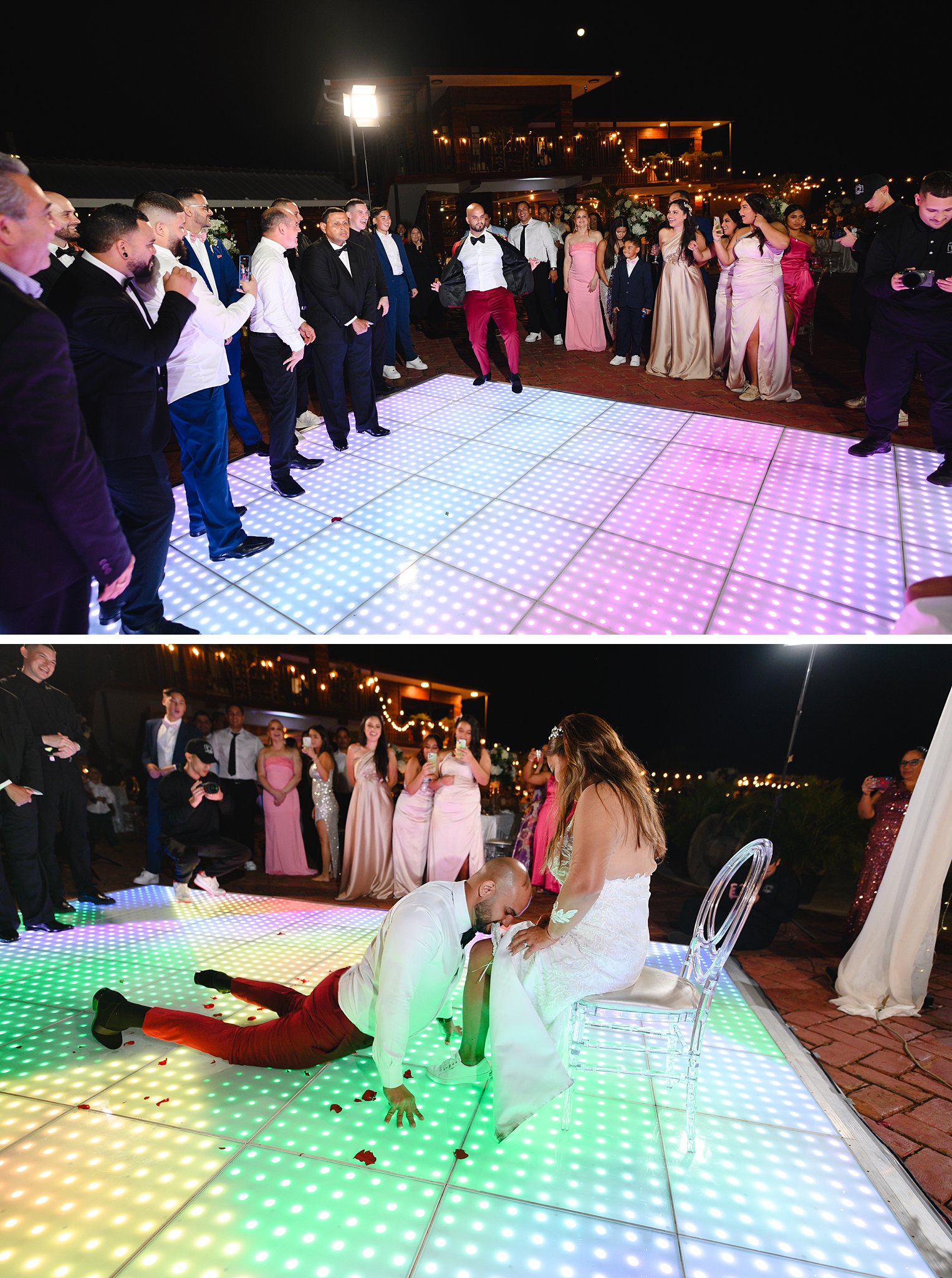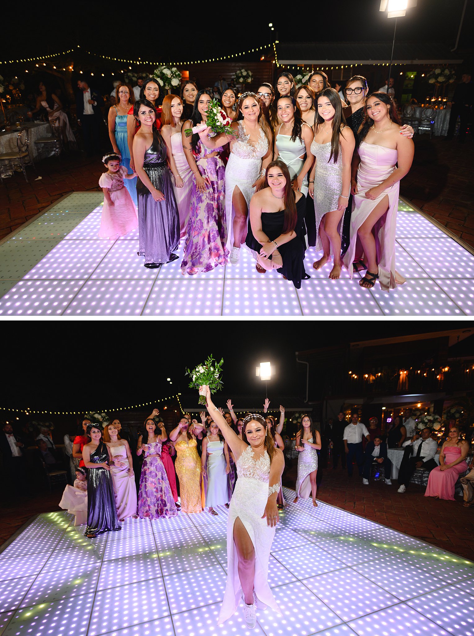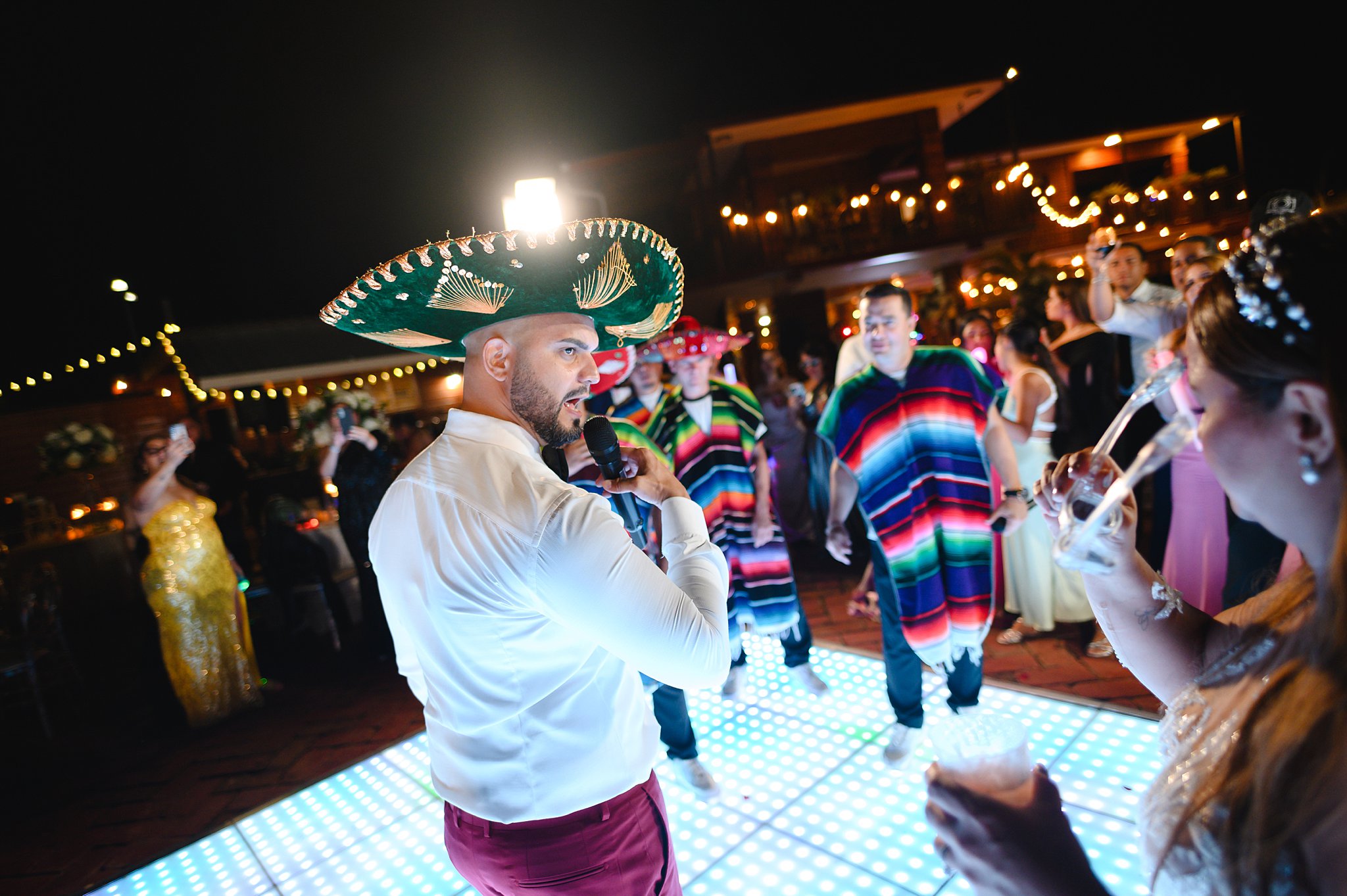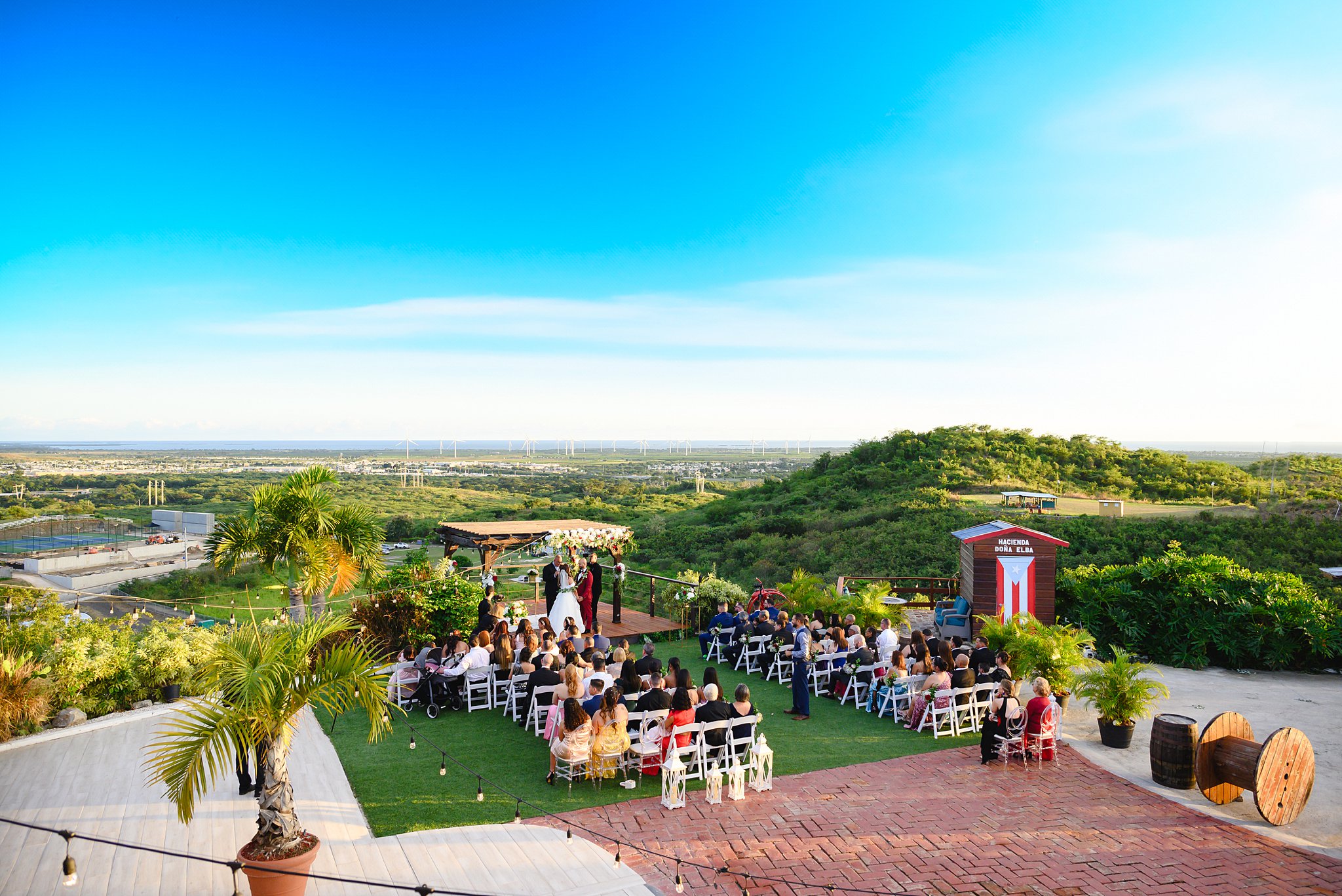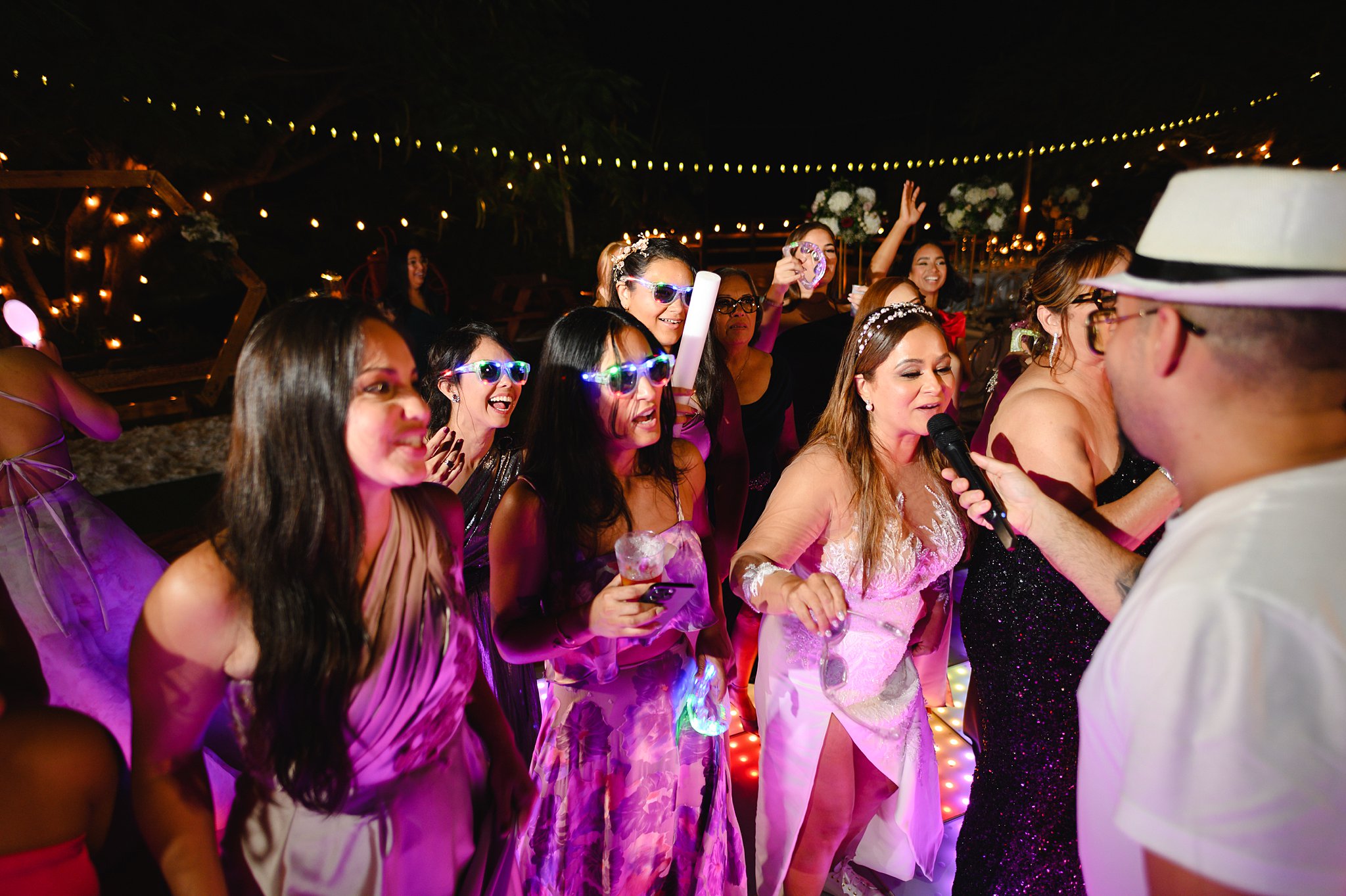 La ceremonia y la recepción tuvieron lugar al aire libre, bajo un cielo azul claro y una suave brisa que acariciaba nuestras mejillas. Una pista de baile iluminada fue el centro de atención, con los nombres de los novios proyectados y una gama de colores cambiantes que añadían un toque mágico a la fiesta, cortesía de DJ Obryam.