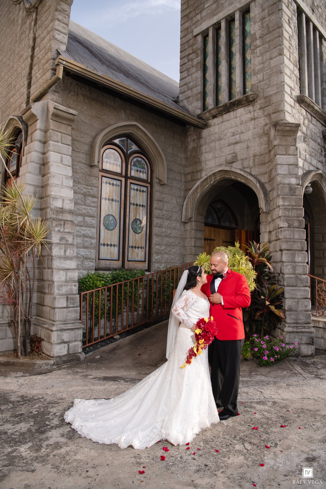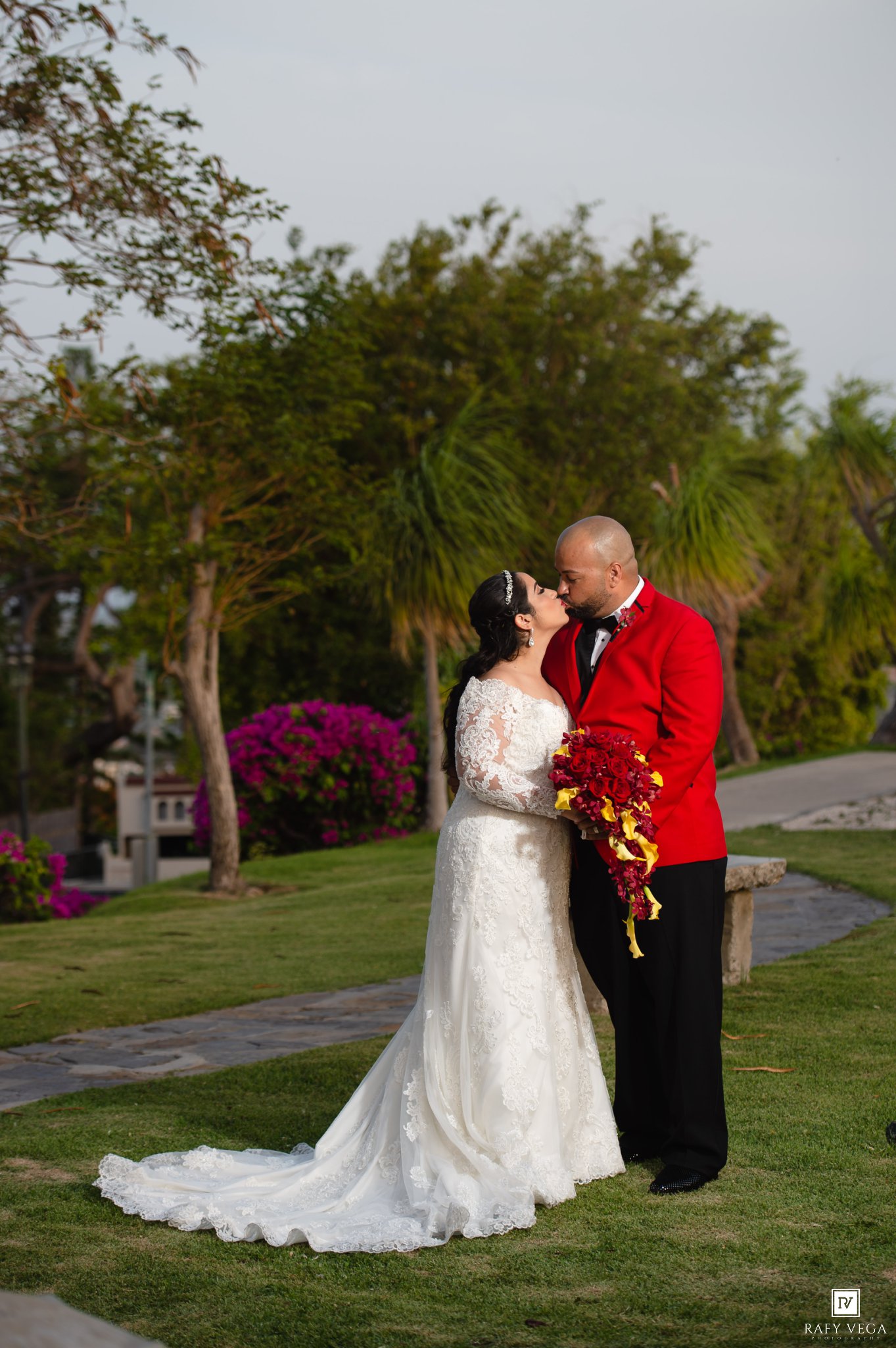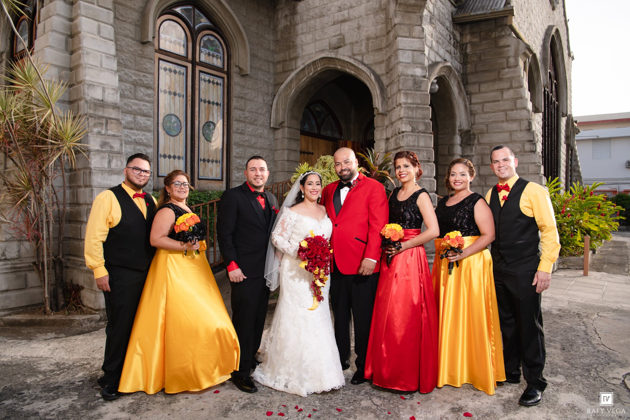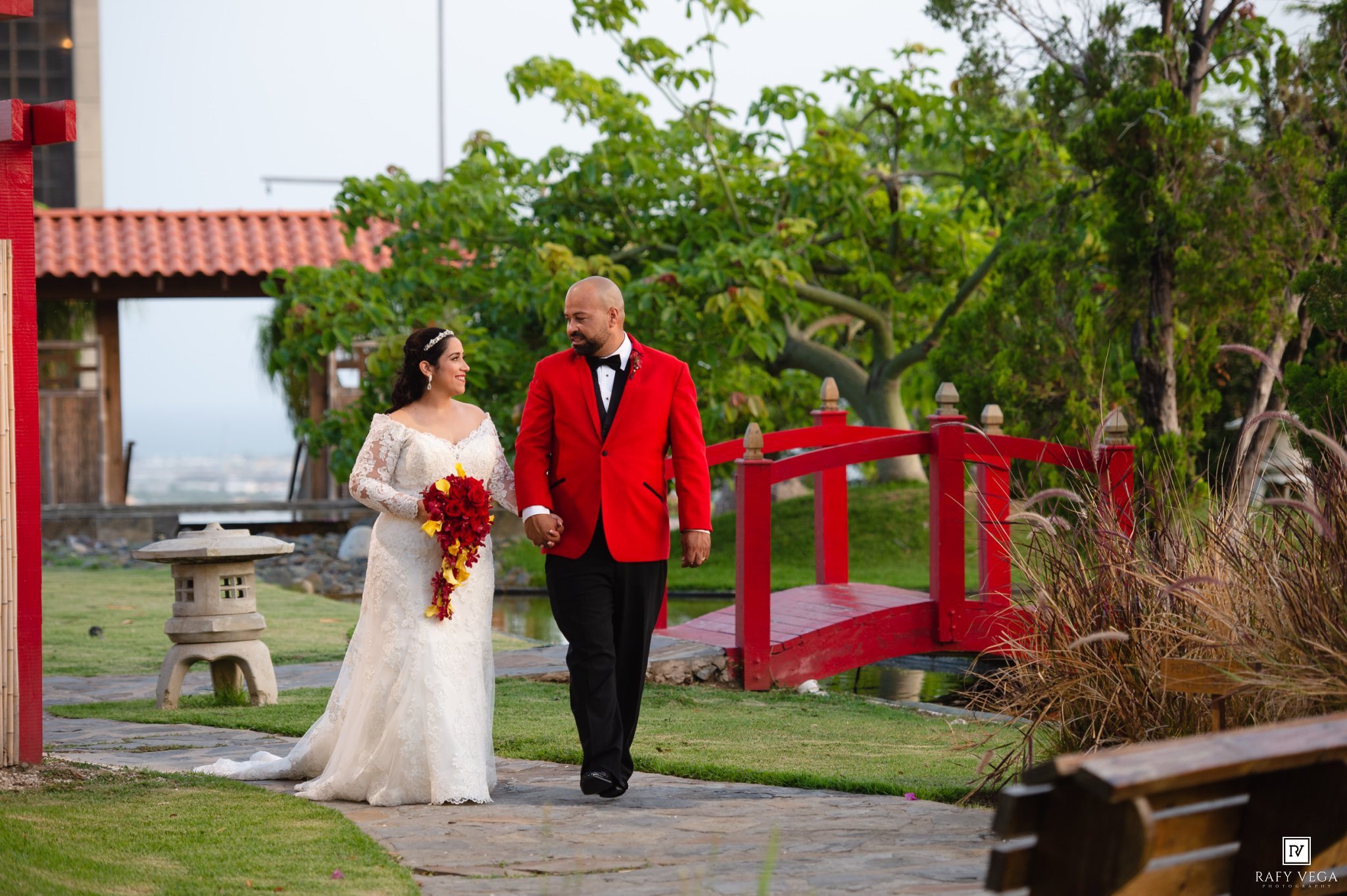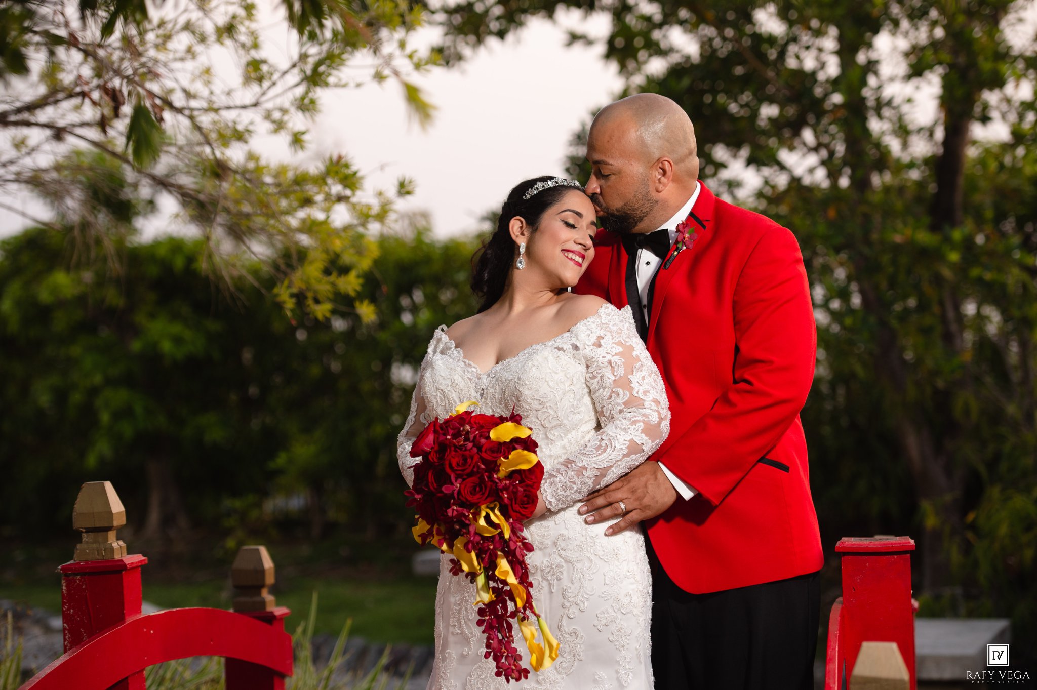 Nelson y Mylvarie se casaron en la Iglesia Metodista La Resurreción, una de mis iglesias favoritas en Ponce por su fachada de piedra en el exterior. La preparación de ambos fue en el Ponce Plaza Hotel & Casino allí aprovechamos la fachada colonial del lugar y por su puesto el Balcón Saurí fue uno de los escenarios preferidos por los novios. La fiesta fue en el Jardín Japones en Ponce y tengo que confesarles que el lugar estaba precioso. Lydia Sierra definitivamente hizo un trabajo espectacular en el lugar utilizando la combinación de los colores rojos y amarillos.