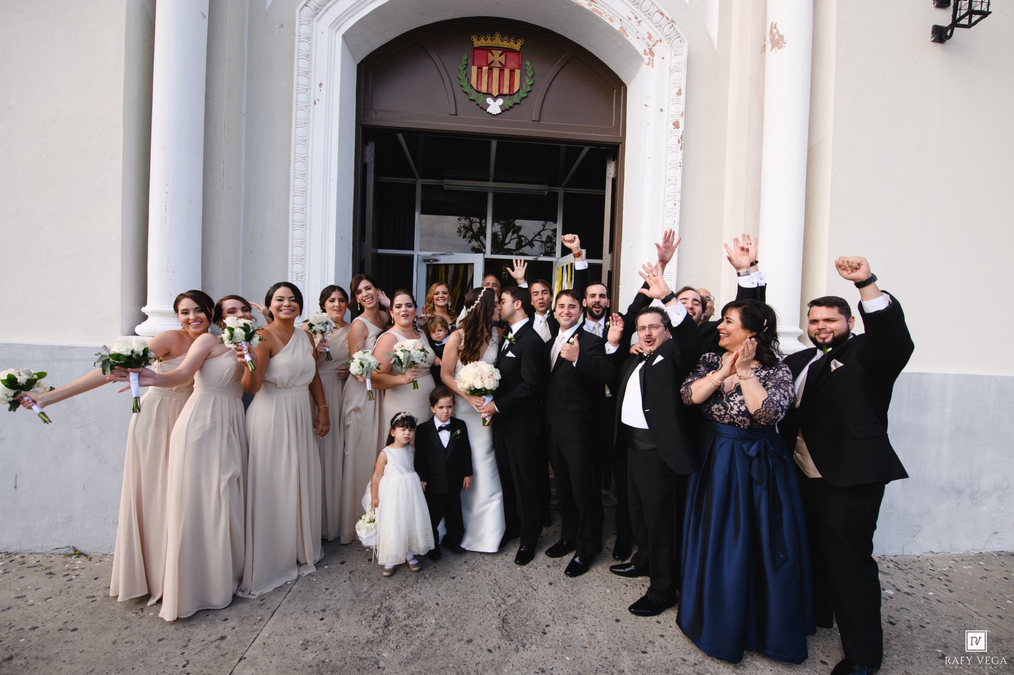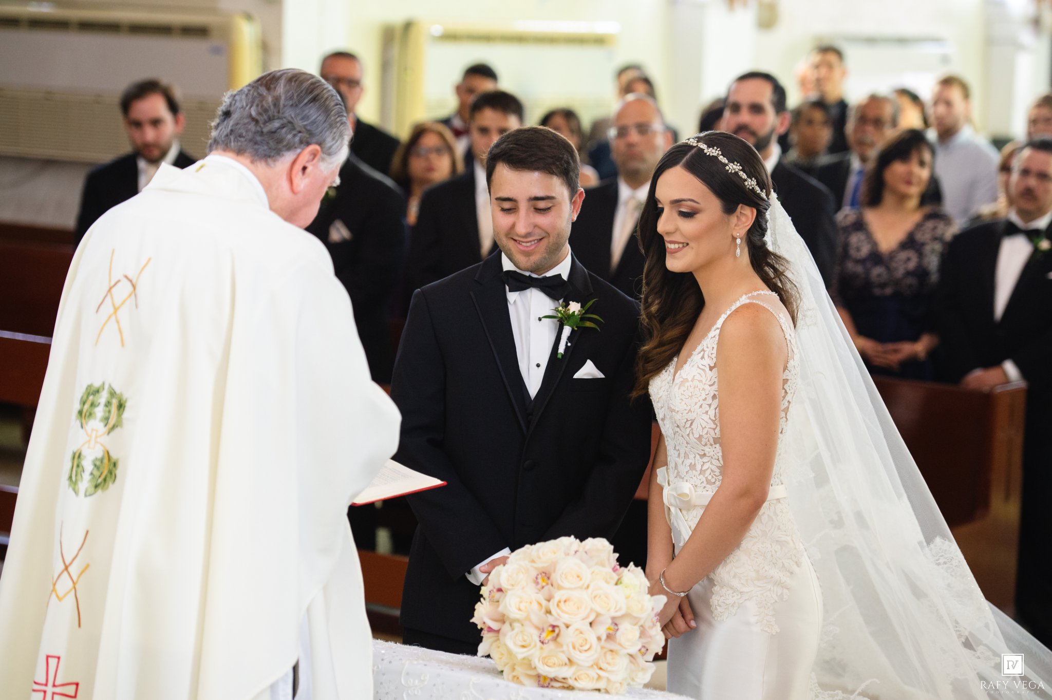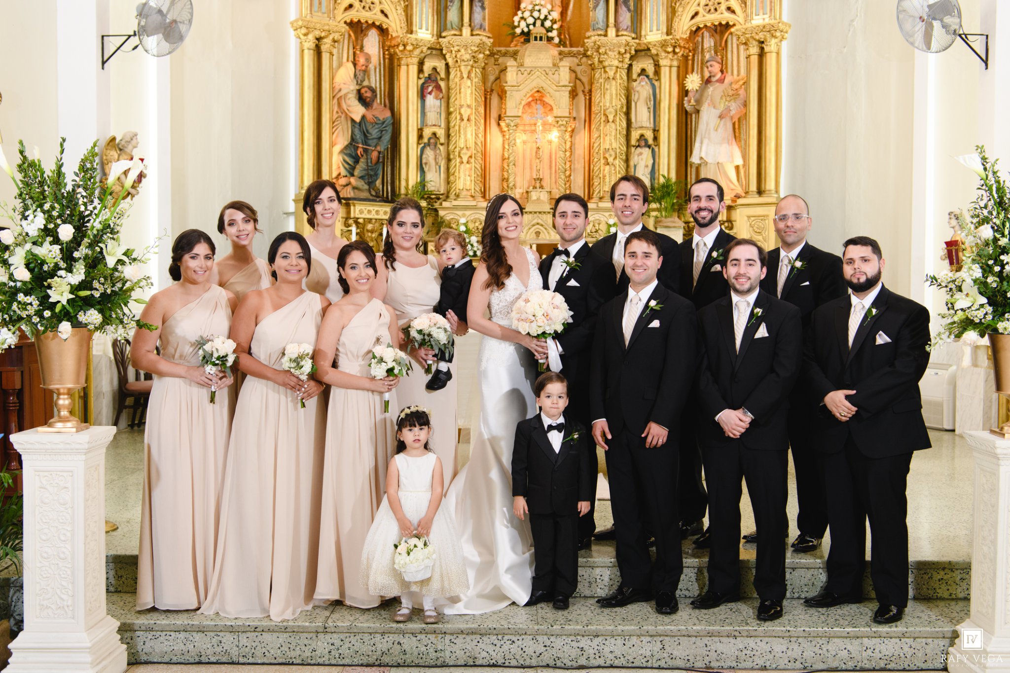 Karla & Andrew siempre los recordaré como una las parejas más alegres que jamás haya retratado. Literalmente no paraban de sonreír, su emoción era evidente y lo demostraban en cada instante. Comenzamos las primeras fotos en la residencia de Karla y aunque el tiempo amenazaba con lluvia lo cierto fue que el día estuvo perfecto. Uno de los momentos más bonitos fue el desfile de entrada, todos desfilaron en perfecto orden y pudimos apreciar a cada uno de los participantes. La ceremonia fue en la Iglesia La Merced ubicada en la calle Luna en Ponce. Esta iglesia es una de las más populares para bodas ya que cuenta con un diseño único y un altar hermoso color oro.