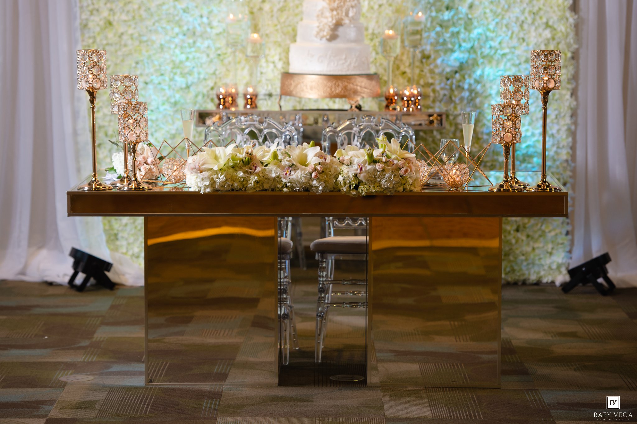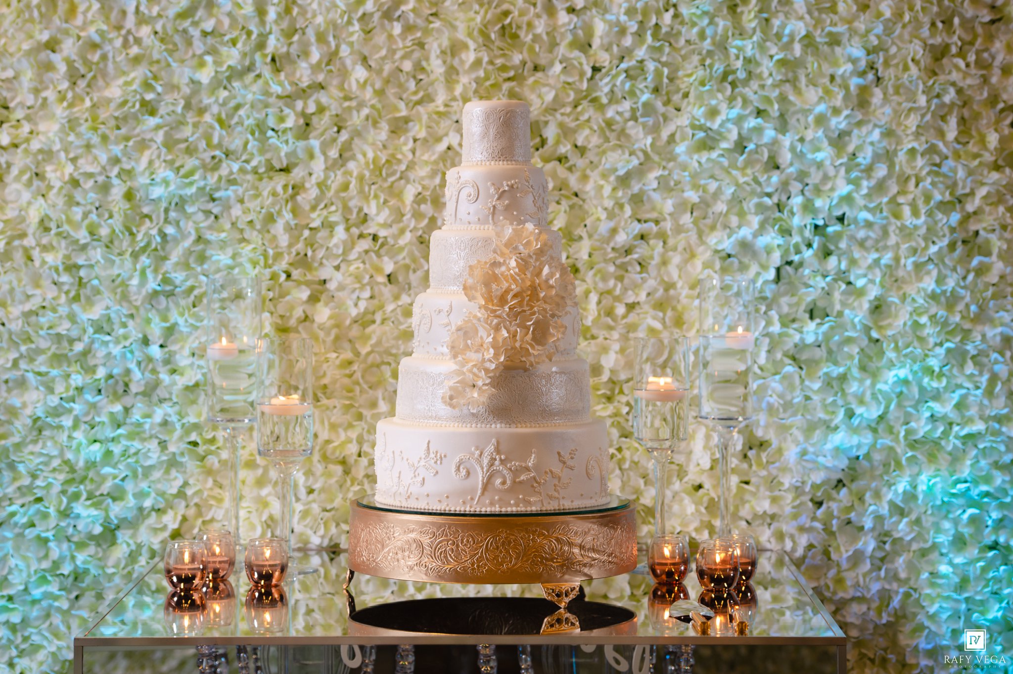 Luego de terminada la ceremonia nos dirigimos directo al salón Pavilion de Ponce Hilton Hotel para algunas fotos de los novios en el salón y exterior. La impresionante decoración por Germaine Quiñones hacia perfecta combinación con el bizcocho confeccionado por Azuarte.